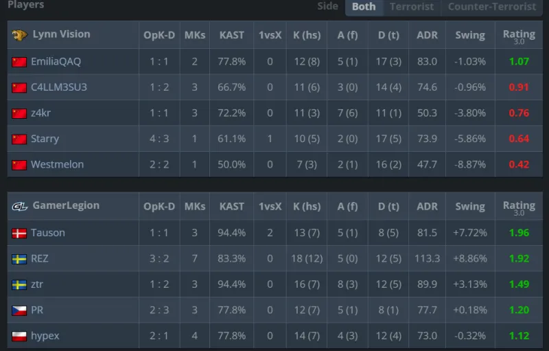 下半场易边再战,LVG *** A区进攻,GL选择放弃A区防守进行五人回防,LVG守包成功拿下手枪局。GL下一局选择强起,LVG进攻A大进行短暂交火后选择转B,GL防守不及再下一城。GL被迫进入经济局。但在经济局GL的FN57取得双杀后,LVG进攻陷入停滞,GL拿下经济局。随后GL的A区防守滴水不漏,大狙强势拿下三杀率先取得赛点。LVG虽再度靠犀利枪法拿下一分,但在OP实力差距过大,最终GL以13-5的比分拿下自选图。