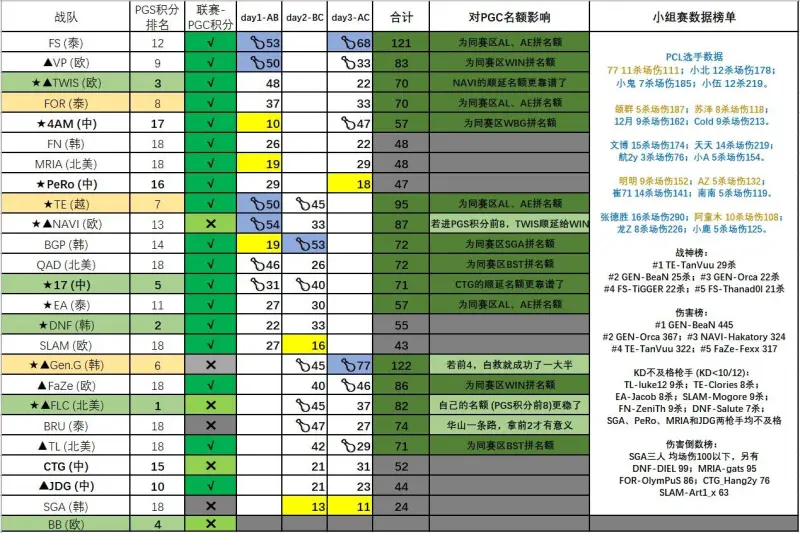 2、各队小组赛积分、吃鸡情况、PCL选手详细数据、选手数据榜单和各队P.GS积分排名、P.GC晋级状态等详情表